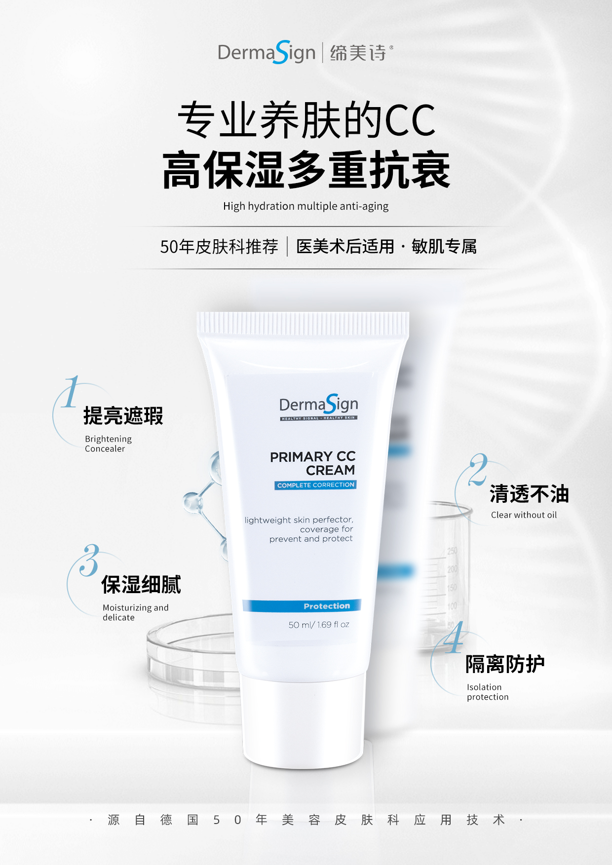 在缔美诗做过皮肤护理的美眉应该会有了解这款CC。它和日化线的彩妆系列有很大区别。它严苛算起来它应该被划入功效护肤品类。出品于德国51年皮肤科临床应用的DermaSign品牌,它拥有不凡的资质和资历。
