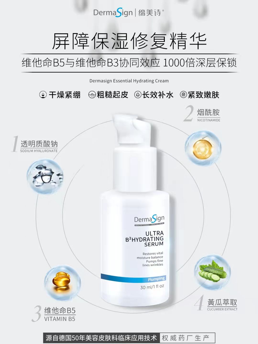 这个产品我们也叫它B²,它通过德国药妆DLMS技术把维他命B3和维他命B5配方在一起,得到的是一个两两相乘的效果,那维他命B3其实也叫烟酰胺,它不但可以增加神经酰胺的分泌,修复屏障,还可以抑制油脂分泌,提高胶原合成,抗糖化。在医学上,维生素B5已被验证是具有制造抗体功能的,历来被成为人体健康保护神。作用于皮肤而言,能加强对角质层的保湿作用和水合作用,改善皮肤粗糙度、皮肤剥落和皮肤弹性,保护皮肤免受外界刺激及表面活性剂SLS带来的损伤。