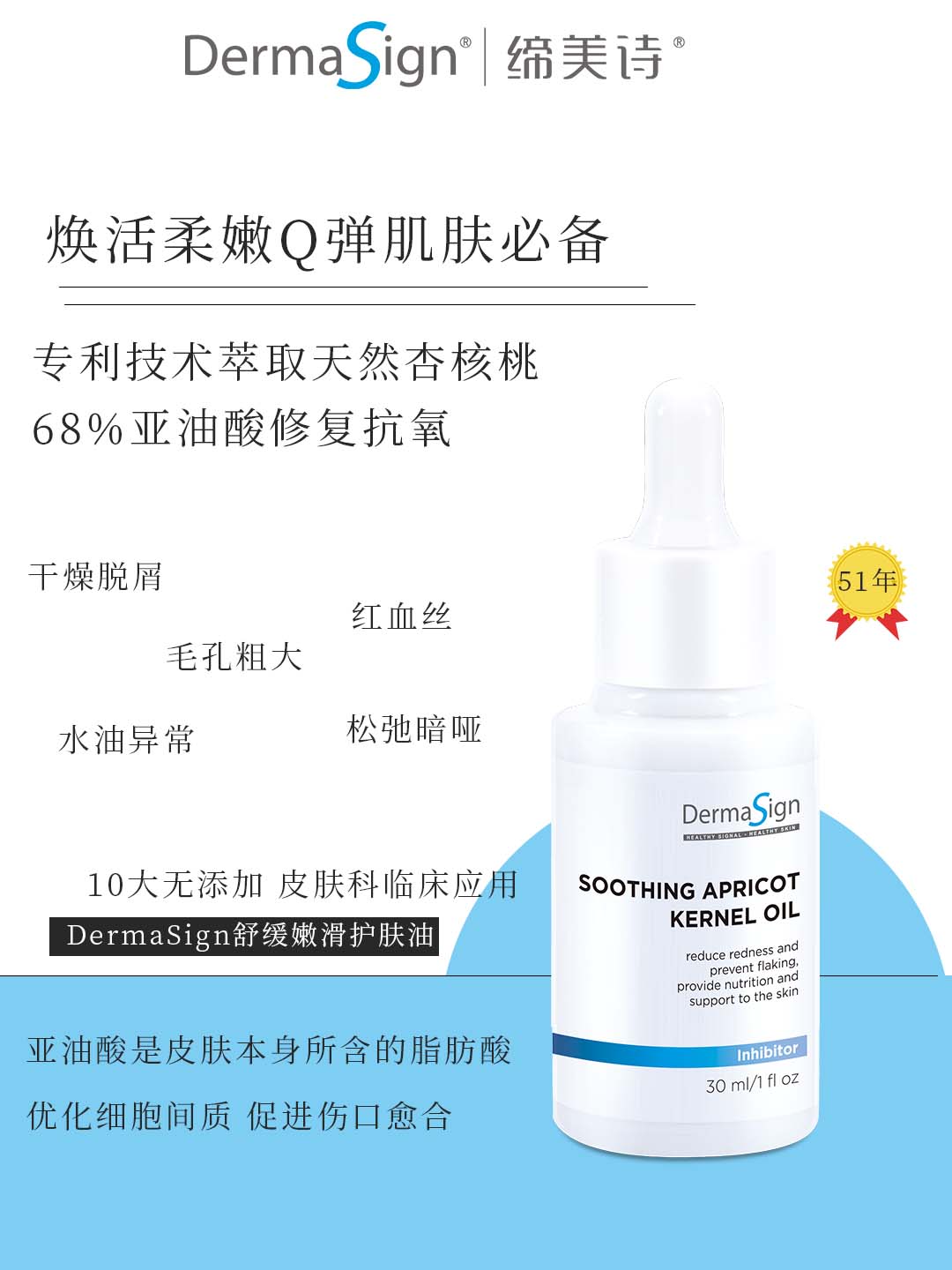 缔美诗亚油酸是德国专利技术从杏核桃萃取的,可以改善皮肤干燥,泛红,脱屑,炎症性红肿热痛,缓解刺痛症状,敏感肌的福音。